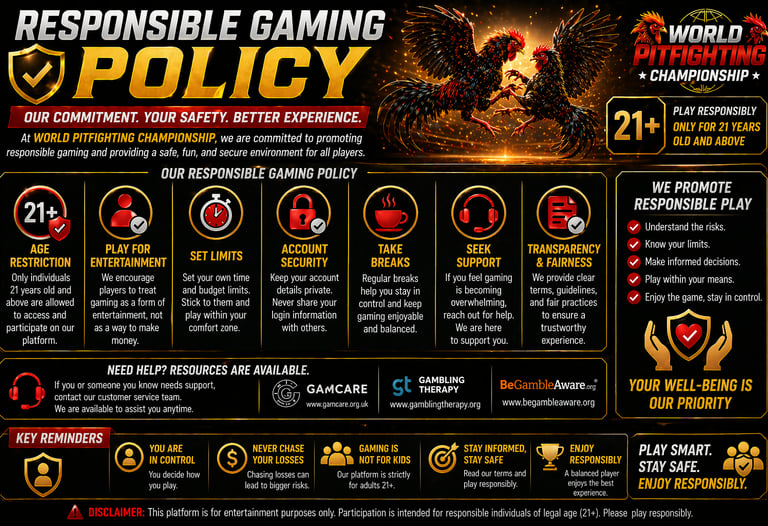 One of the key policies is strict age restriction. Only individuals aged 21 and above are allowed to access and participate on WORLD PITFIGHTING CHAMPIONSHIP. This ensures that all players are legally eligible and capable of responsible decision-making.