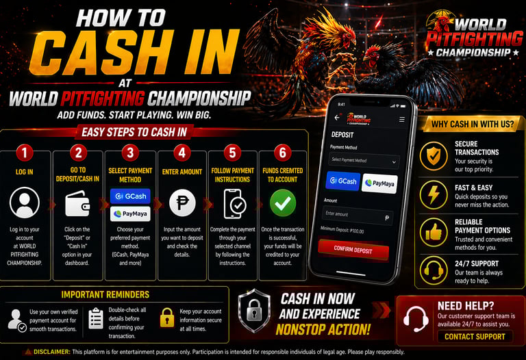 To begin, log in to your account at WORLD PITFIGHTING CHAMPIONSHIP. Once you’re inside your dashboard, look for the Deposit or Cash In section. This is where you can manage and add funds to your account.