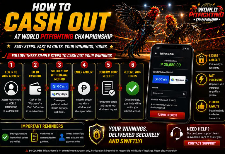 To begin, log in to your account at WORLD PITFIGHTING CHAMPIONSHIP. Once inside your dashboard, navigate to the Withdrawal or Cash Out section. This is where you can manage and request your payouts.