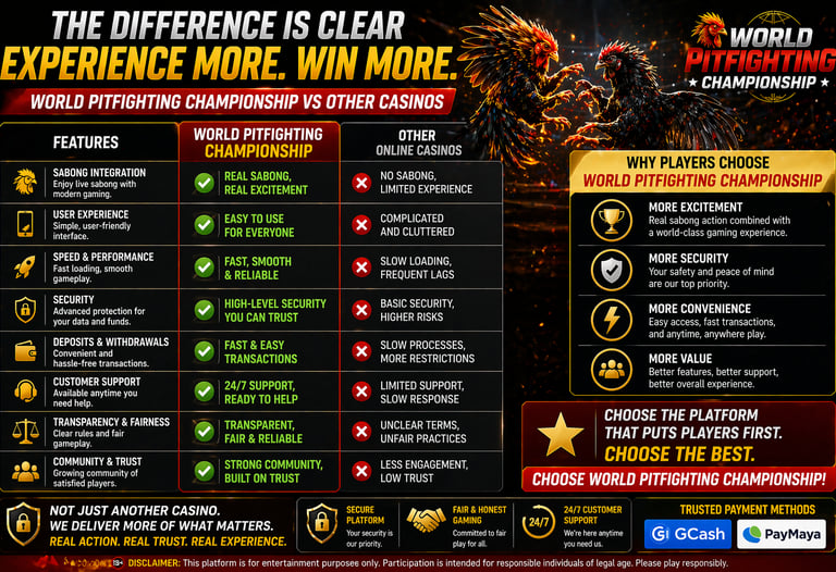 One of the biggest differences is the platform’s integration of sabong with modern gaming features. While most casinos focus solely on traditional games, WORLD PITFIGHTING CHAMPIONSHIP delivers a dynamic environment where players can enjoy real-time sabong alongside other entertainment options. This creates a more engaging and diverse experience.